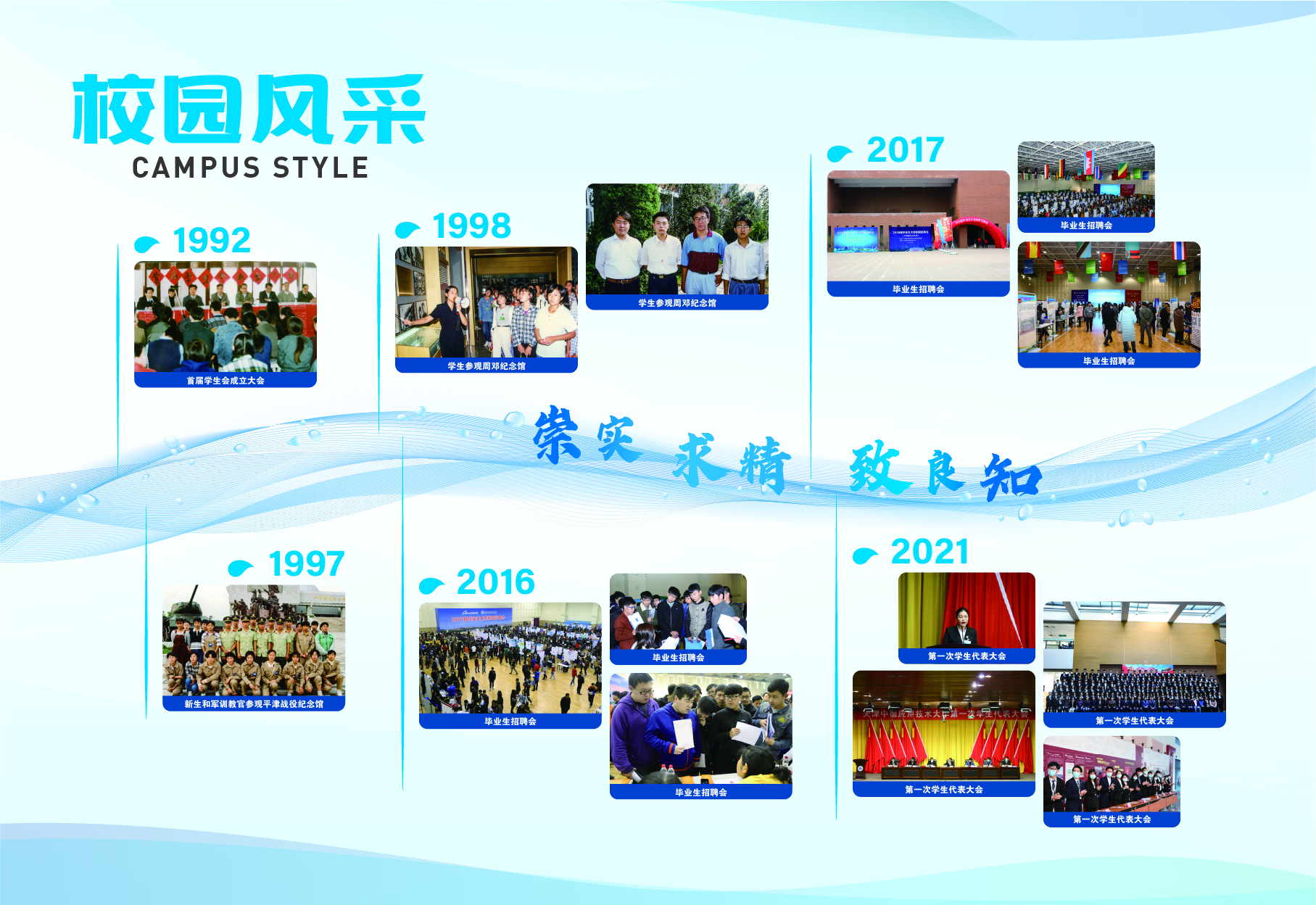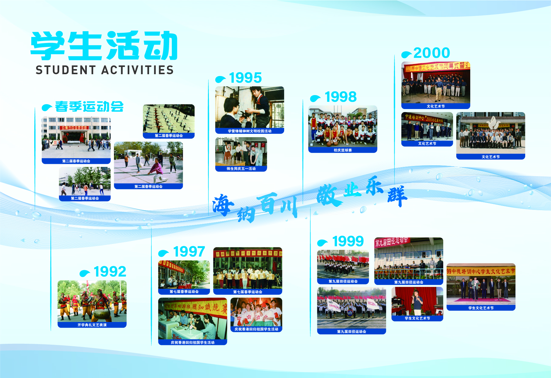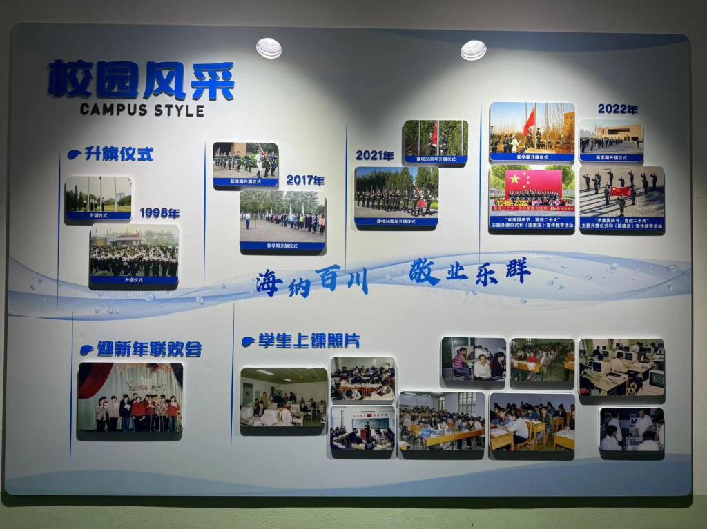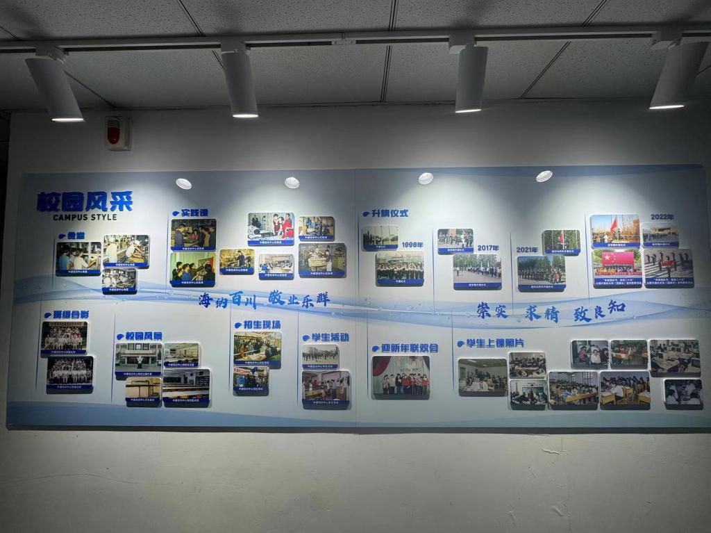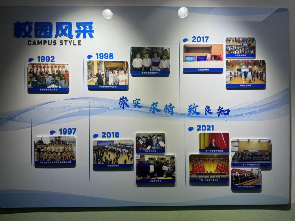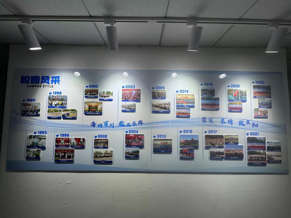 2023-2024學年第二學期開學初,黨委學生工作部(學生處、人民武裝部)在學校檔案系統中挑選出具有代表性的圖文資料,結合中德精神和學生的興趣點,歸納設計出“校友展示”、“校園風采”和“學生活動”三大模塊,并按照年份順序進行排列,以“靈動的海河水”進行串聯,“海河”上印有中德校訓、中德精神或“環境+秩序=質量”的標語,最終形成15面中德文化墻。