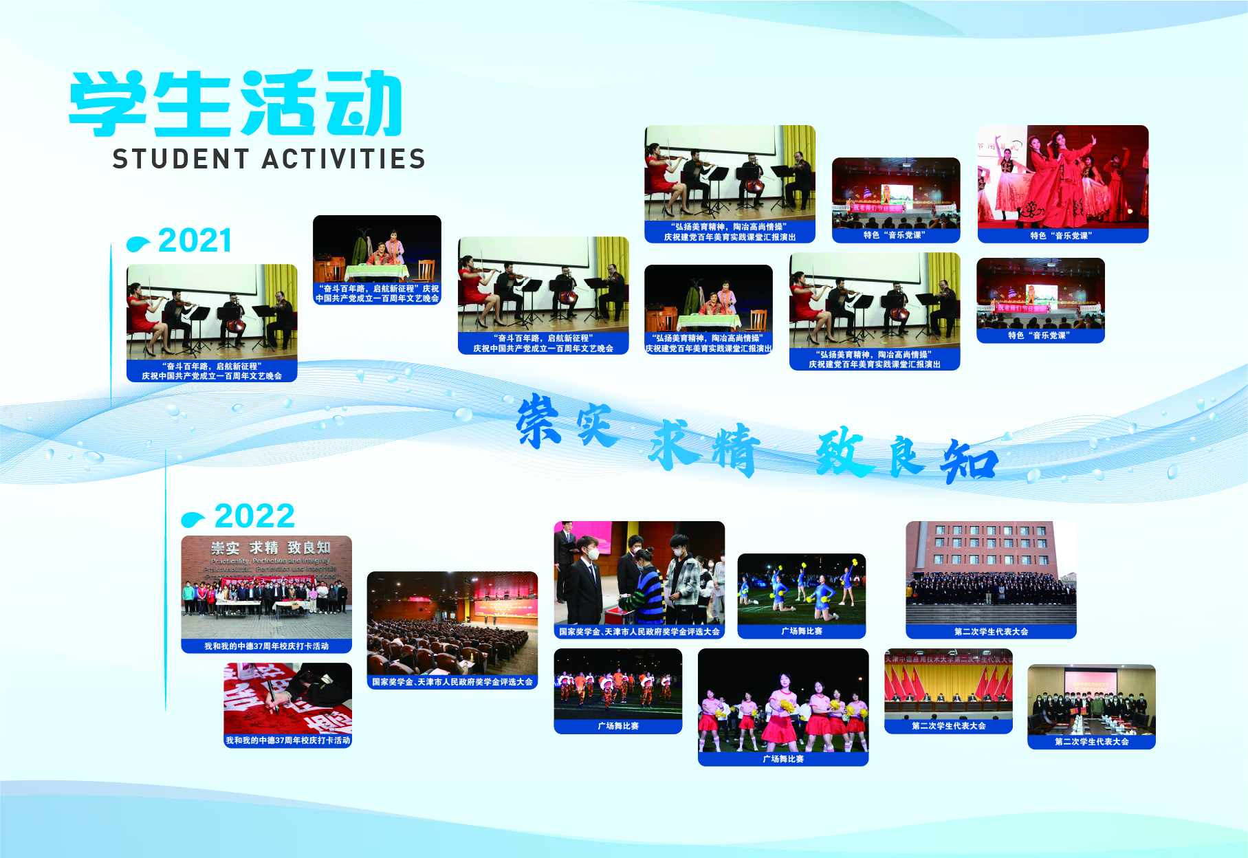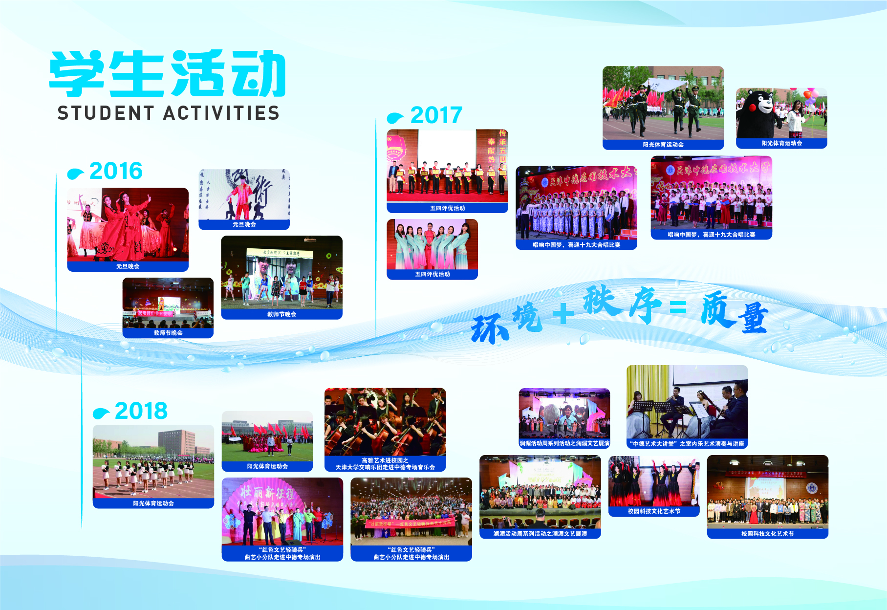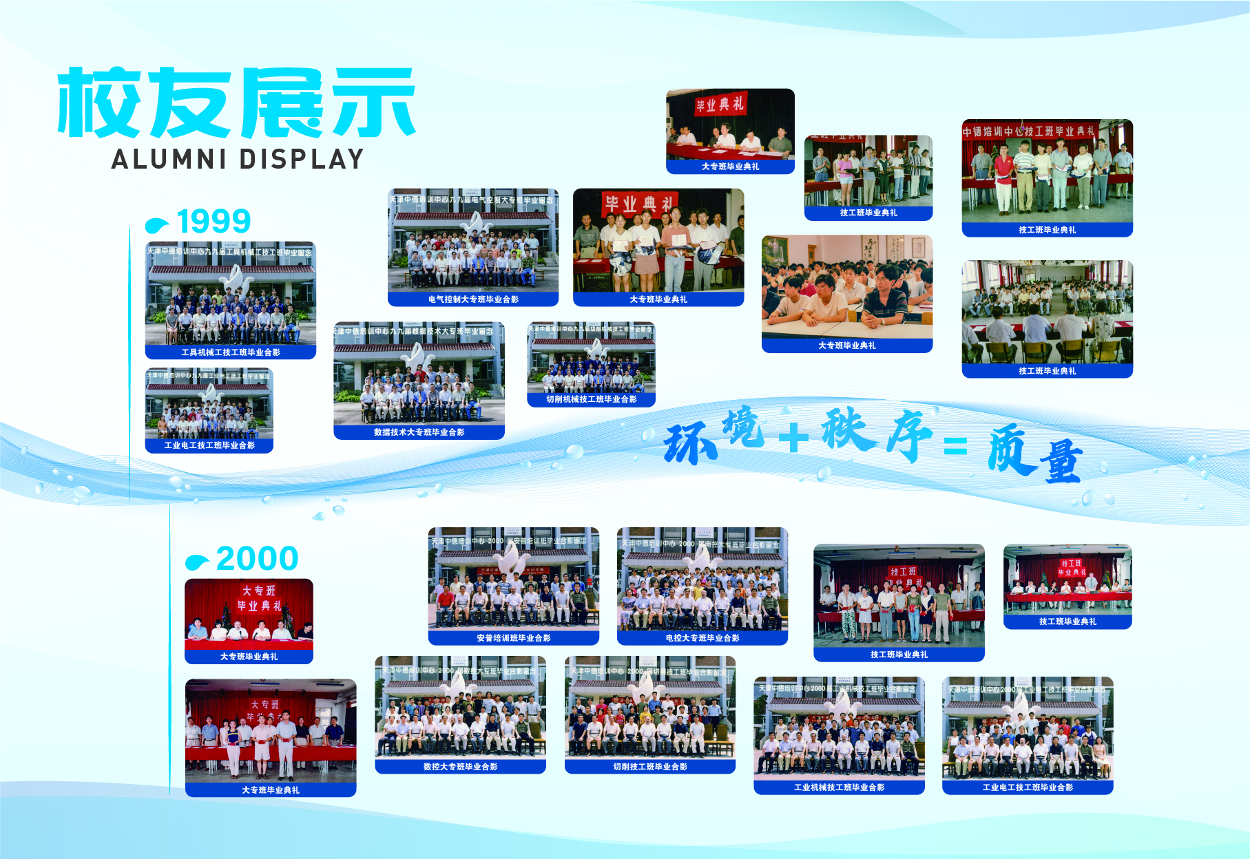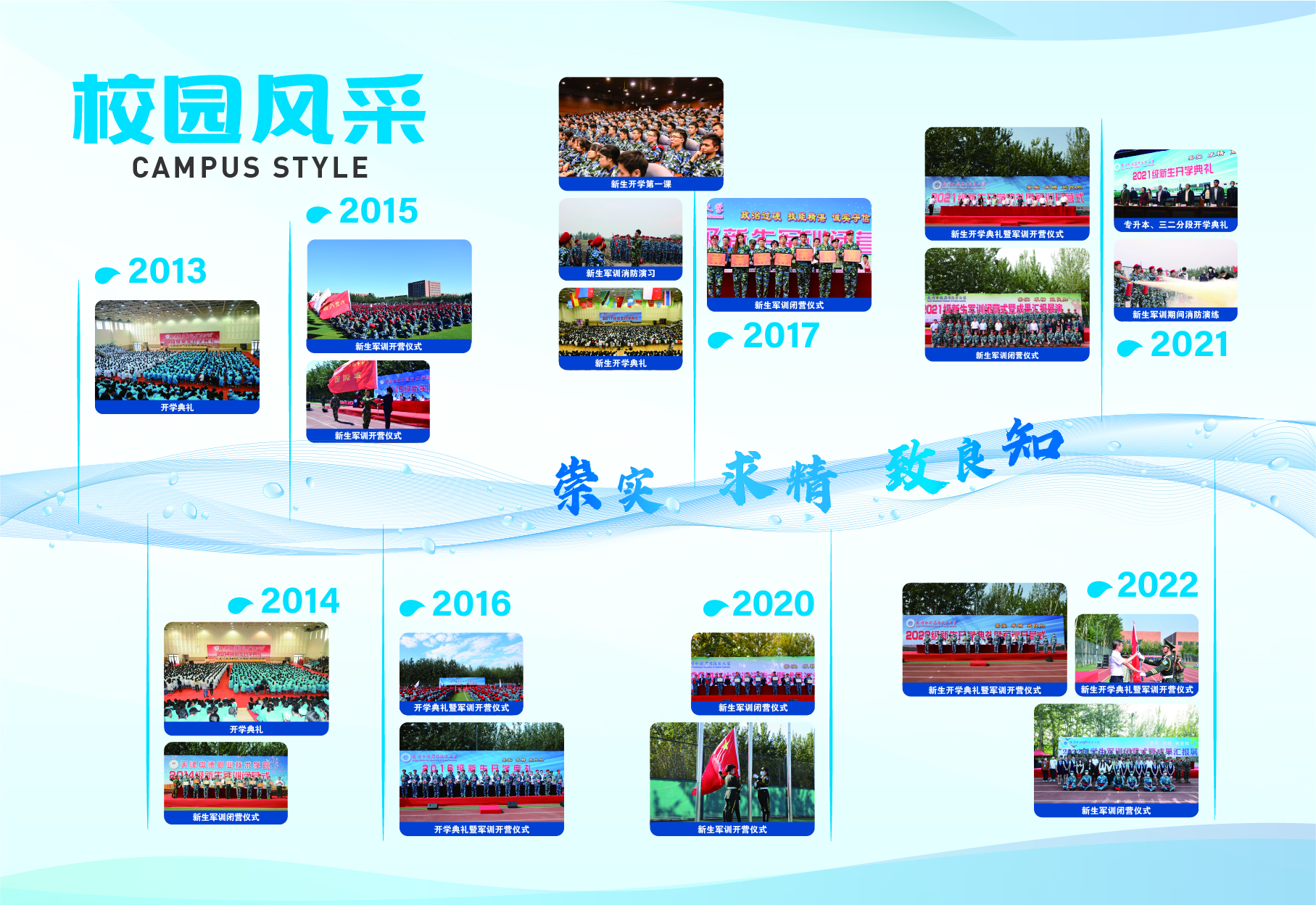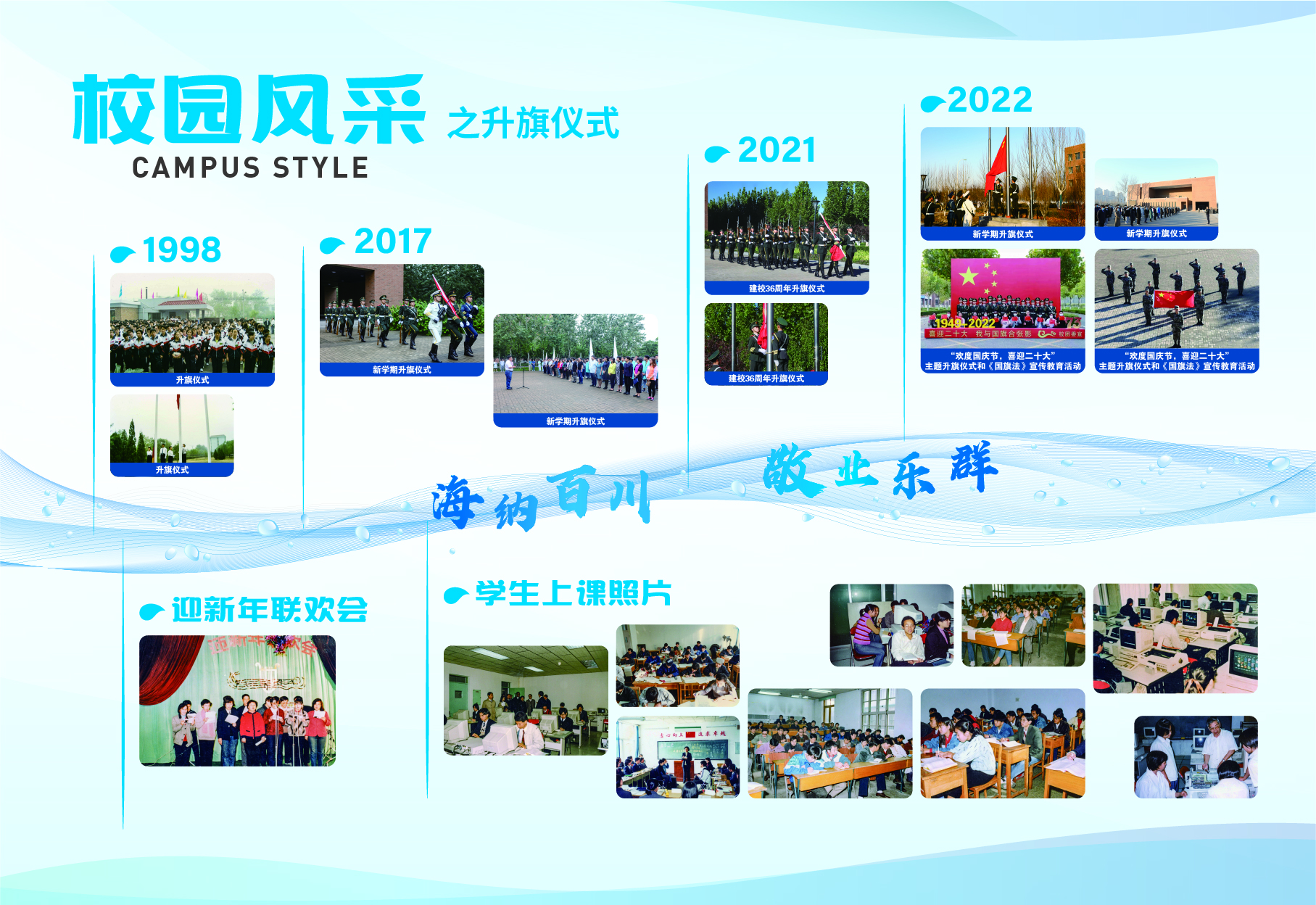 2023-2024學年第二學期開學初,黨委學生工作部(學生處、人民武裝部)在學校檔案系統中挑選出具有代表性的圖文資料,結合中德精神和學生的興趣點,歸納設計出“校友展示”、“校園風采”和“學生活動”三大模塊,并按照年份順序進行排列,以“靈動的海河水”進行串聯,“海河”上印有中德校訓、中德精神或“環境+秩序=質量”的標語,最終形成15面中德文化墻。